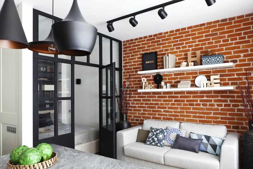 Маленькая квартира не повод отказываться от стиля лофт. Даже небольшое пространство можно грамотно организовать добавив светлых оттенков, света и стильных деталей. Для такого помещения подойдет большое зеркало на кирпичной стене. Отраженный свет раздвинет границы.