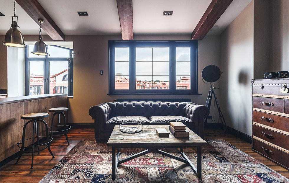 Ваша гостиная будет выглядеть в соответствии со стилем, если в ней окно большого размера, пол из деревянных досок, грубо отделанные стены и тяжелый диван, обитый кожей или плотным текстилем. Рядом с диваном можно разместить яркие пуфики или кресла и журнальный столик. В помещении не должно быть лишней мебели, оставляйте свободное пространство. Открытые полки стеллажей и ниши будут служить для размещения книг и сувениров.