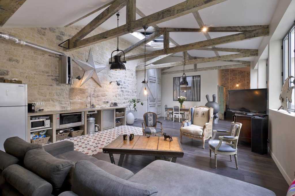 5. Потолки делают белыми или оставляют без покрытия. Оснащают их деревянными балками, пускают провода или вентиляционные трубы.