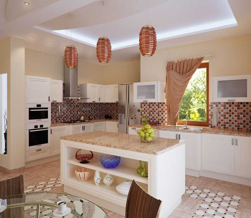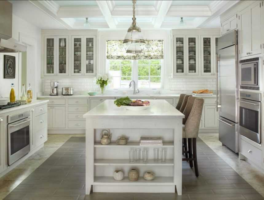 Если кухня квадратная, но при этом большая, в ней можно организовать зону отдыха с небольшим диваном и парой удобных кресел. В случае, если имеется классическая печь, – ее можно задекорировать и использовать в качестве камина. Более практичное и современное решение – островная кухня. Такая планировка пользуется большой популярностью в Европе. В центре кухни можно расположить рабочую зону, бытовую технику. Чаще всего тут располагается столешница для готовки с многочисленными ящиками для хранения продуктов и посуды.