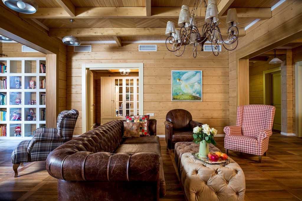 Внутренняя отделка не должна быть навязчивой, ее главные принципы — комфорт и соответствие идее загородного деревянного дома. Искусственные материалы исключаются, поскольку они будут нивелировать эту самую идею.