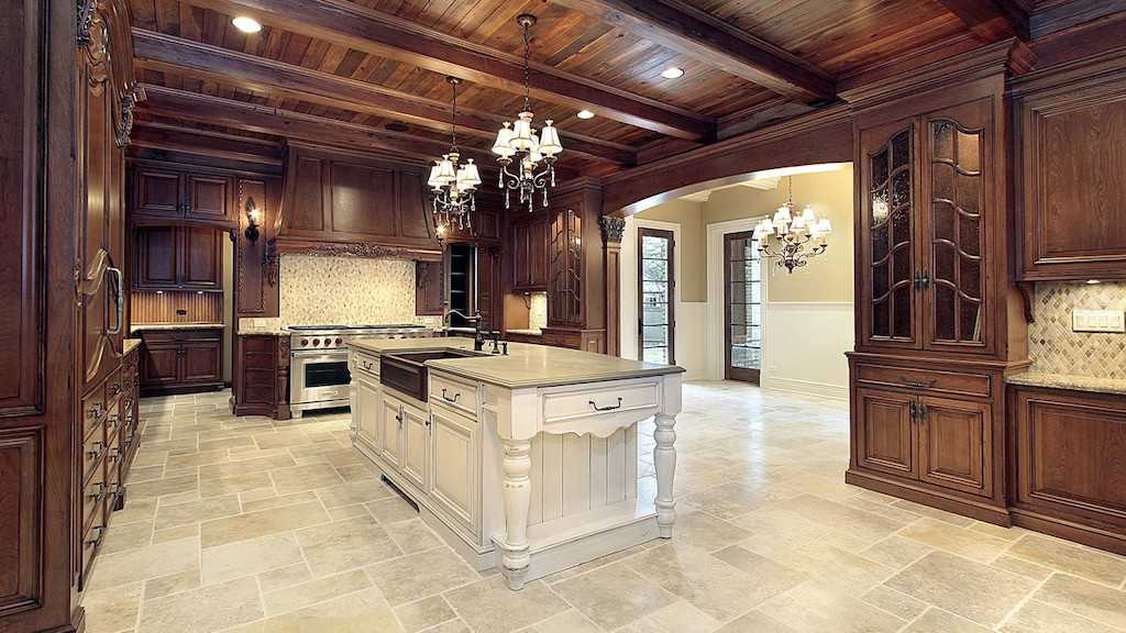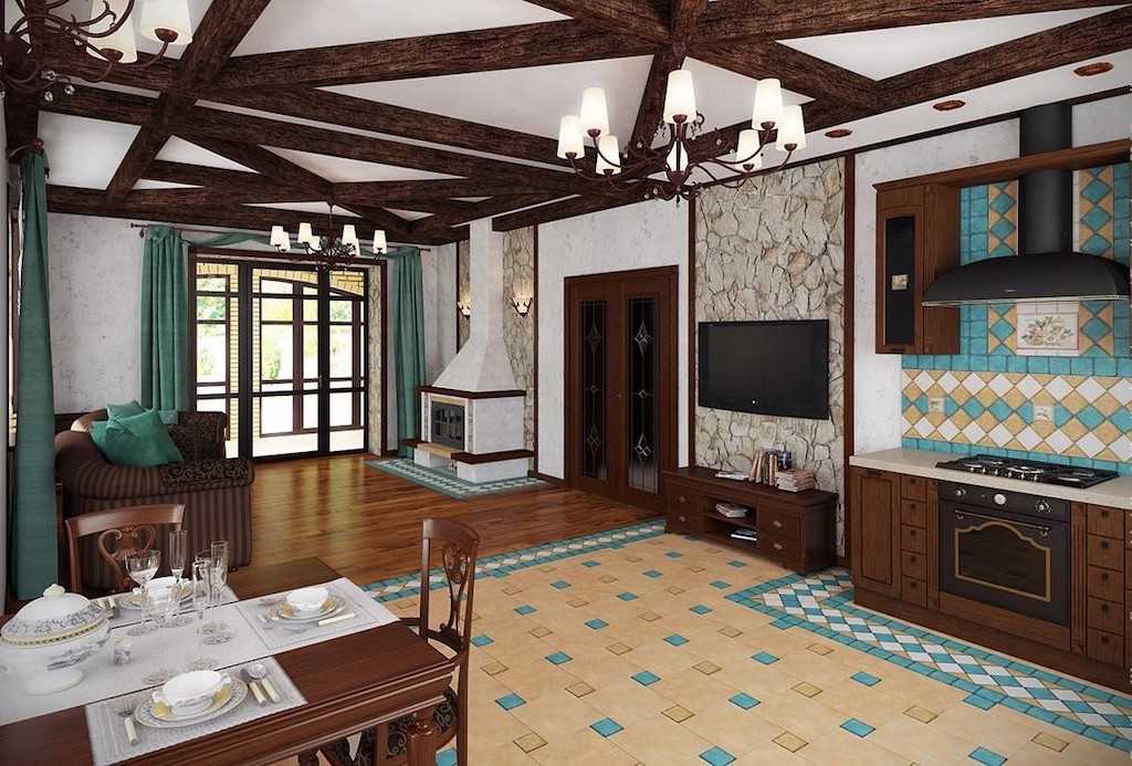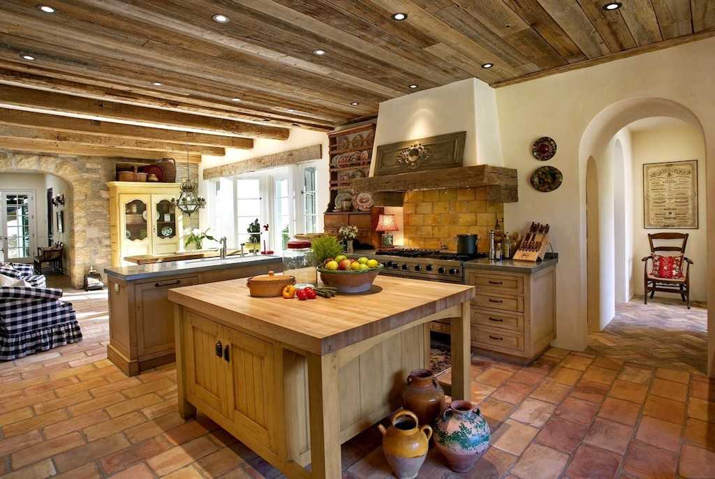 Стиль очень похож на прованс. Здесь также применяется максимум дерева в отделке фасадов, пола, потолка. Существует запрет на применение оргстекла и пластика в такой кухне. Кухонный фартук можно оформить плиткой с растительными узорами.