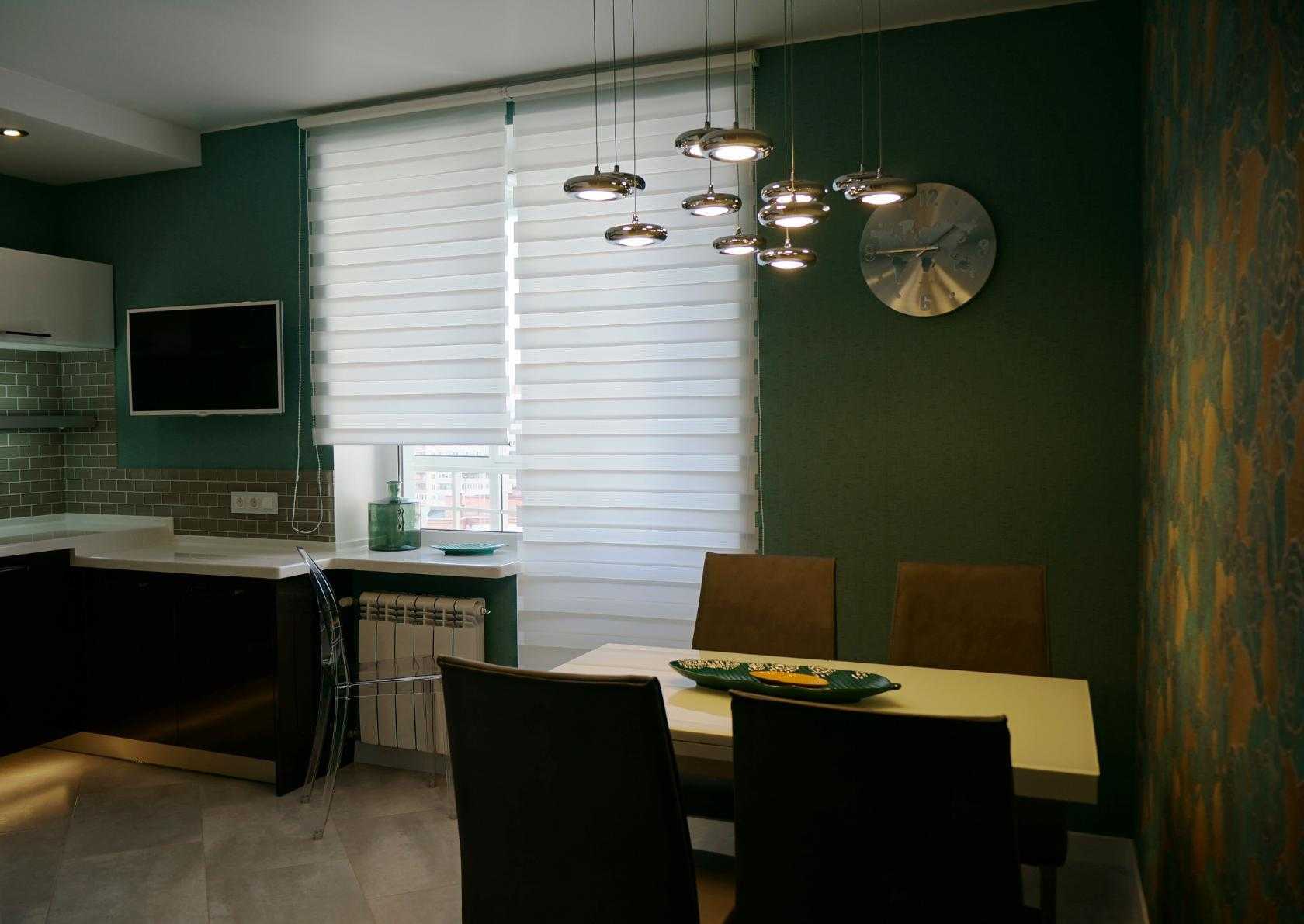 Идеально, если в тех же шторах в рабочей и столовой зоне можно будет найти и сходства, и различия. Например:
