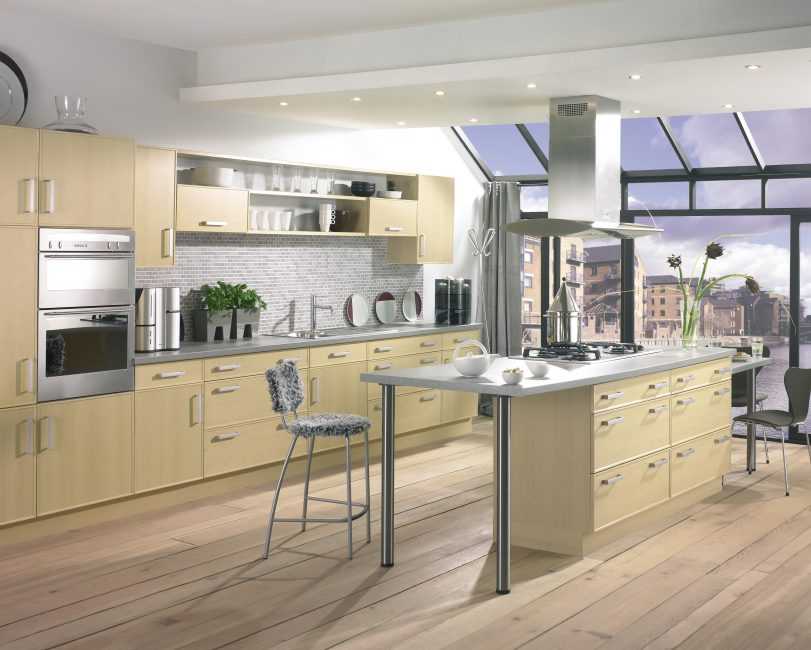 При разработке дизайнерского проекта кухни в загородном доме следует уделить внимание и грамотно расположить инженерные сети в кухонном пространстве. Зону приготовления пищи стоит дополнить вытяжкой с принудительной вентиляцией производительностью от шестидесяти кубических метров в час.