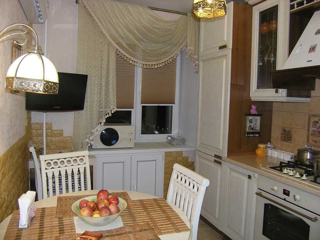 Рисунок на занавесках чаще мелкий в цветочек или с растительными мотивами. Стены окрашены в белые тона, кукурузный или молочный оттенки.