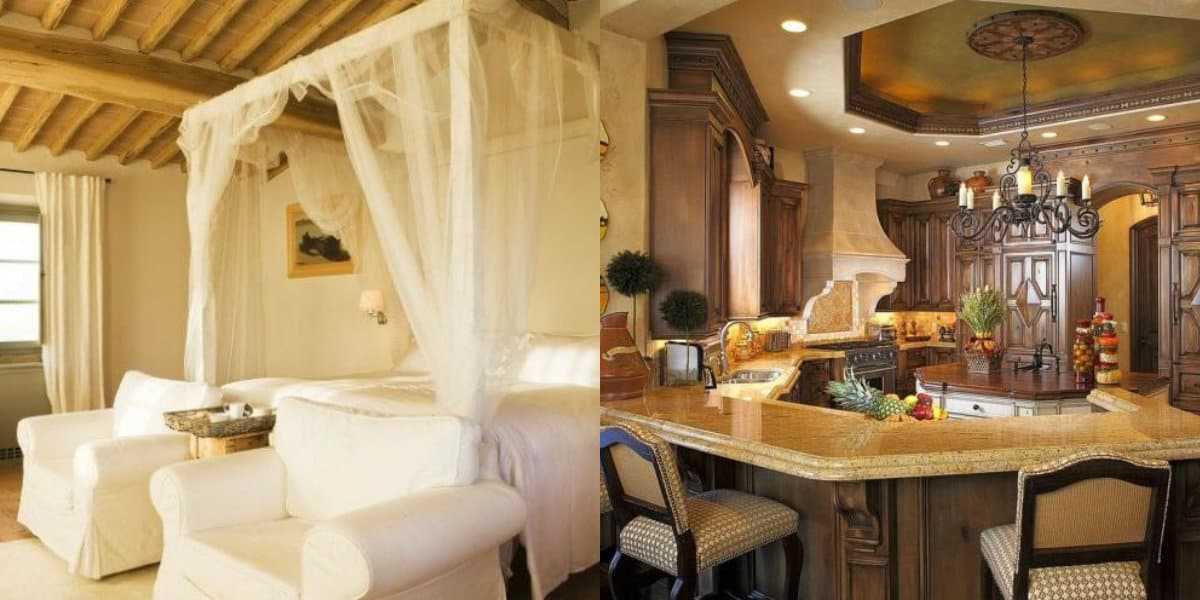 Для стен используют состаренную штукатурку, лепку или фрески. Балки не скрываются, на пол укладывается плитка, мрамор, гранит. Мебель украшается росписью, декором служат вазы с фруктами, расписная посуда, кружево.