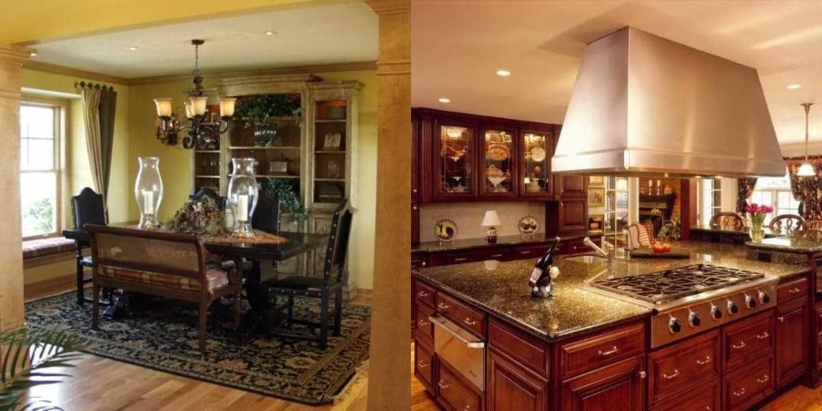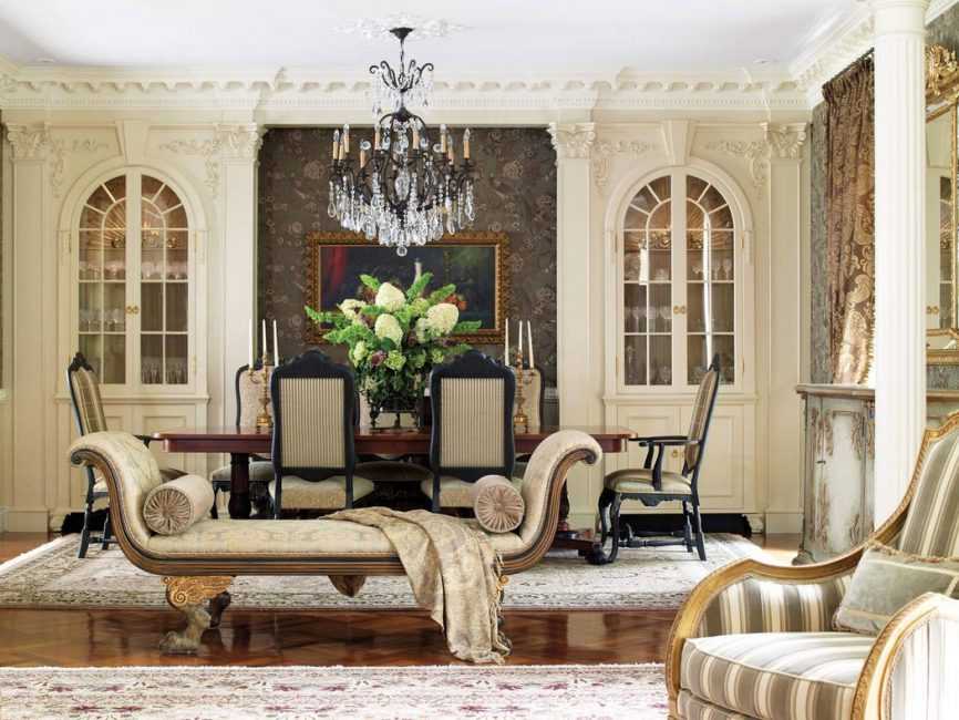 Склонен к показной роскоши, отличается натуральной меблировкой с резьбой, украшением потолка фресками или лепниной с объемной люстрой, арками или колоннами. Для декора используется посуда в буфете, часы, картины, рамки и самодельные аксессуары. Здесь большие окна или выход на балкон, веранду, эркерные окна, свободное пространство и совмещенные зоны, редко используются межкомнатные двери и перегородки.
