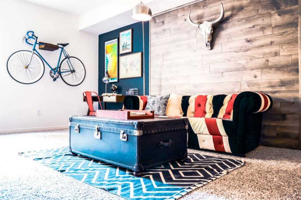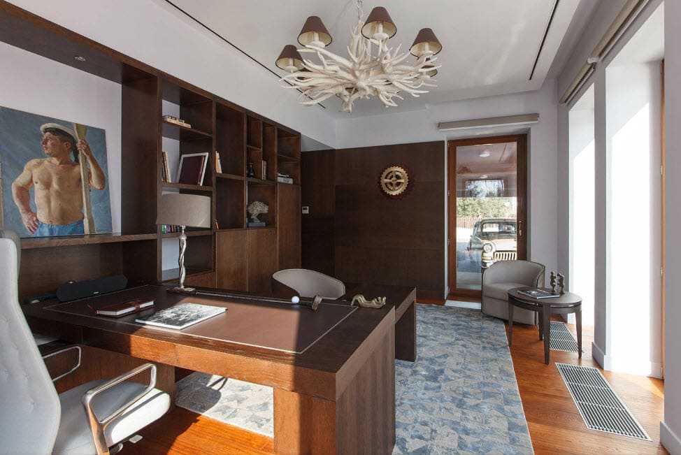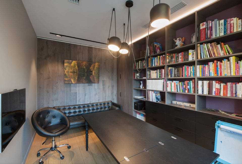 Несмотря на строгость стиля, это помещение предназначено добавить комфорт и уют. Здесь идеально будет расположить большие диваны и кресла, обитые кожей или темной тканью.