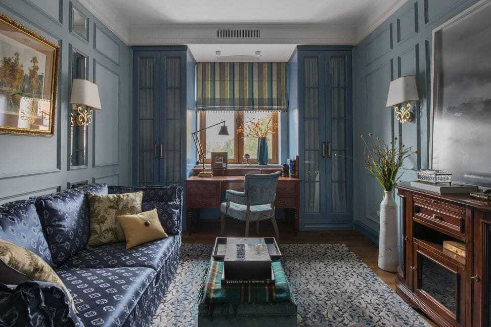 Вообще, типичным признаком дизайна комнат считается отделка в темной приглушенной гамме цветов. Если окна помещения выходят на юг, то отделку выполняют в холодных тонах (зеленый, голубой, синий, серый и т. д.), если окна выходят на север, то в теплых (шоколадный, охра, песочный и др.).