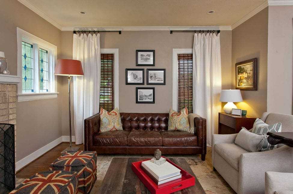 Диваны и кресла дополняют мягкими удобными подушками. Обивка мягкой мебели должна гармонировать со стенами и шторами. Нередко расцветка на шторах повторяется на подушках и мебельном текстиле.