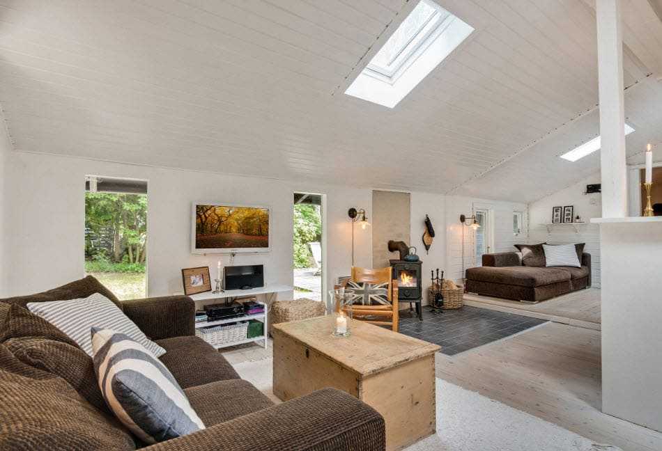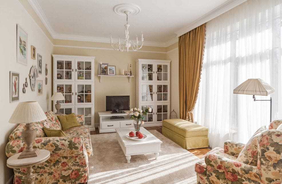Потолок во всем доме должен быть белым. Возможно использование лепнины или деревянных балок. Отличным решением для гостиной будет размещение камина.
