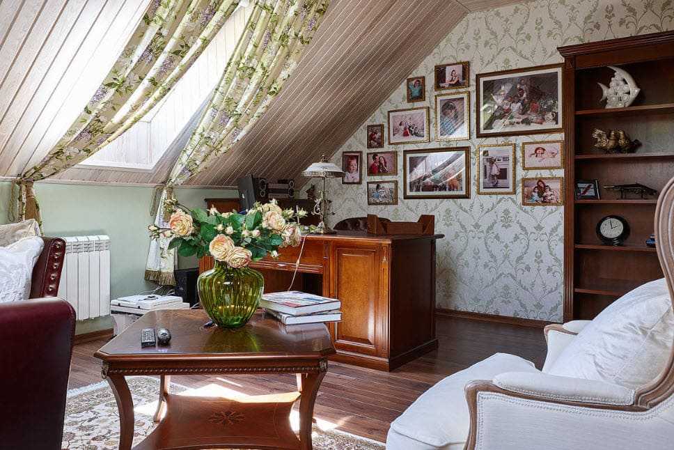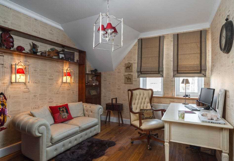 Элегантный домашний кабинет в английском стиле. Обои с цветочным принтом не создают тяжести в интерьере