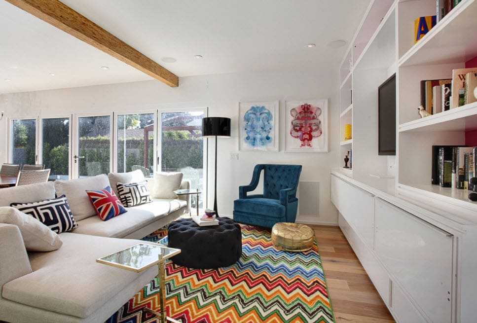 Основным помещением подобного дома стала гостиная. Традиционно она соединяется с холлом и примыкает к кухне и столовой.