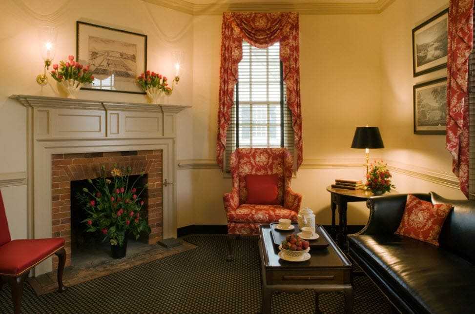 Композиционным центром английской гостиной является камин. Независимо от его внешнего оформления — деревянной рамы, кирпичной или каменной кладки — над этим «королём гостиной» обязательна полка. На ней обычно размещают памятные фотографии, коллекционный фарфор, подсвечники и другие аксессуары. Дополняют пространство кованой переносной решёткой, экраном, удобным креслом с изящной скамеечкой для ног.