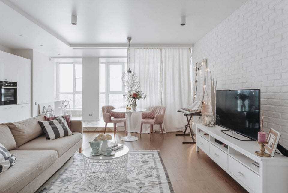 Для разделения пространства в гостиной используют в основном предметы мягкой мебели, а также разнообразные столы и стулья.