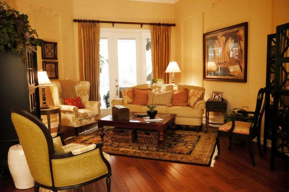 Английский стиль предполагает более темные цветовые решения, чем большинство современных домов. Это темный пол (включая красные и коричневые оттенки). В оформлении стен используются определенные шаблоны. В частности, растительные узоры, которые можно наблюдать на шторах, подушках, скатертях. Остановив свой выбор на осенней цветовой палитре, вы добьетесь потрясающего результата.