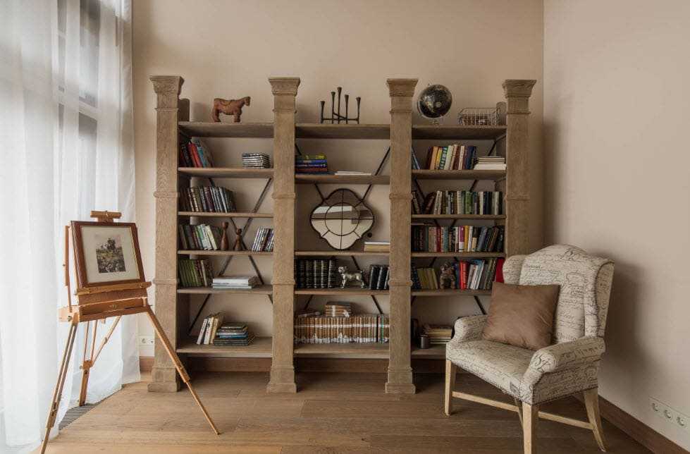 Высокие деревянные шкафы с книгами в тисненых переплетах – еще один признак английского стиля. Шкафы могут устанавливаться как в гостиной, так и в кабинете.