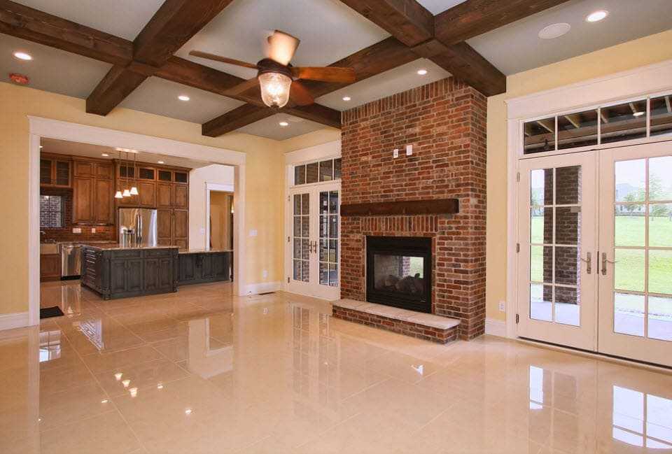 Использование кессонов на потолке добавляет объёма и красоты такой гостиной