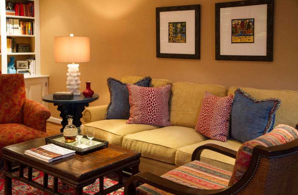 Данный стиль в интерьере предполагает использование благородной цветовой палитры: терракот, охра, все оттенки древесно-коричневого цвета. Также в качестве акцентов могут использоваться темные оттенки зеленого цвета, бордовый и его тона.