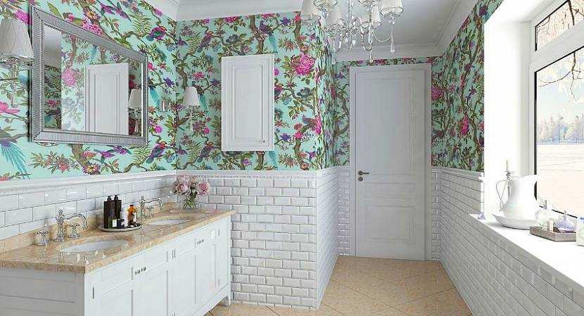 Туалетная комната с белой глянцевой плиткой и яркими обоями на стенахИсточник psk-remont.ru