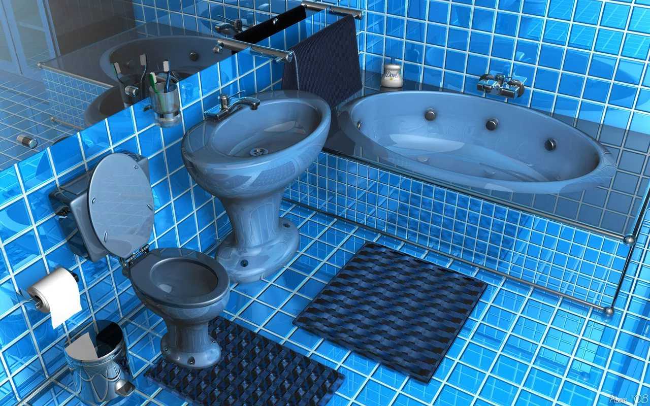 Классический вариант отделки санузла. Используются различные оттенки голубого. Можно оформить все помещение одним цветом, а можно комбинировать несколько разных оттенков голубого.