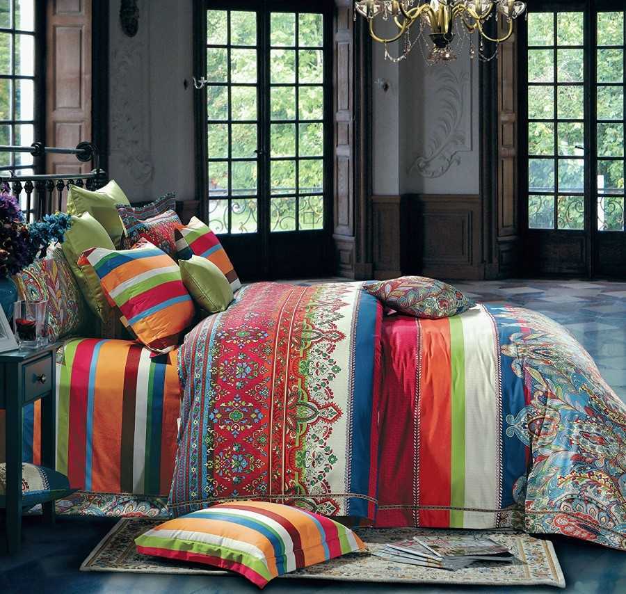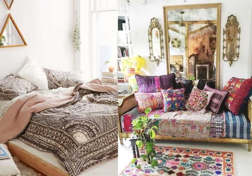 Так, лён комбинируется с бархатом, хлопок − с атласом, мешковина – с шифоном. Из тканей в бохо-стиле складывается почти весь интерьер: чехлы на диванах, покрывала, пуфы, дорожки, ковры, пледы.