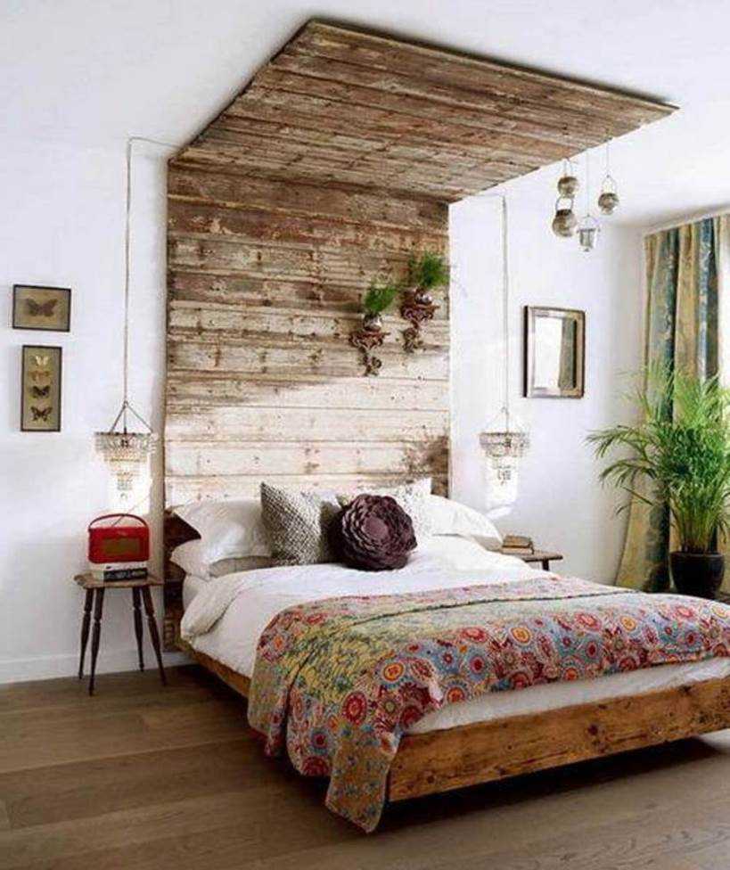 Вместо натяжного потолка отдавайте предпочтение лепнине, открытым балкам или грубой побелке. Стены редко оставляют белыми, но в бохо нет особых противопоказаний для нейтральных тонов. Можно выбрать приглушенные землистые оттенки или покрасить одну из сторон ярким цветом. Хорошо смотрится трафаретная роспись, панно и ковер на стене.