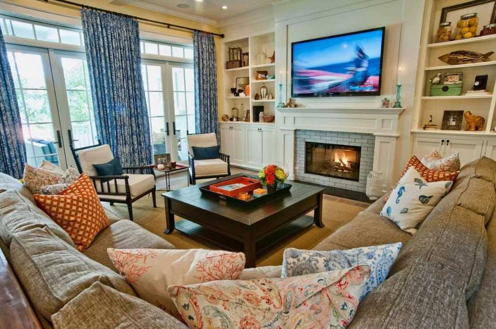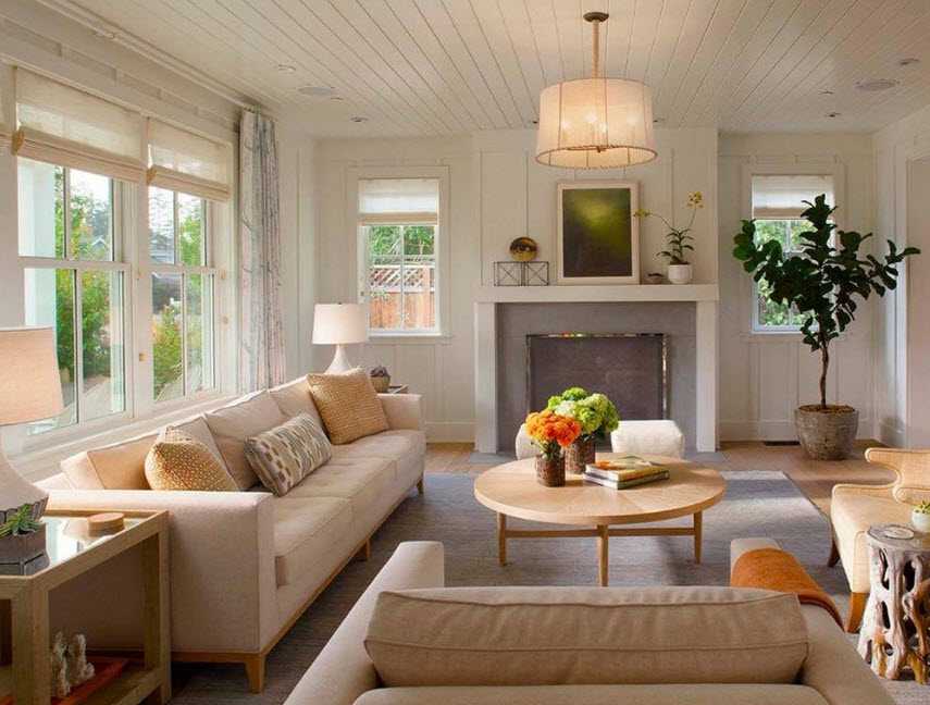 Вся мебель внутри дома должна быть функциональной, удобной и практичной, при этом лучше отдать предпочтение предметам светлой цветовой гаммы (бежевый, мятный, серый или персиковый). Стены и потолок также должны быть светлыми, в качестве ярких акцентов используется текстиль и декор.