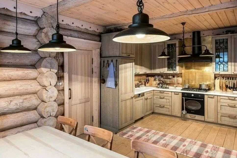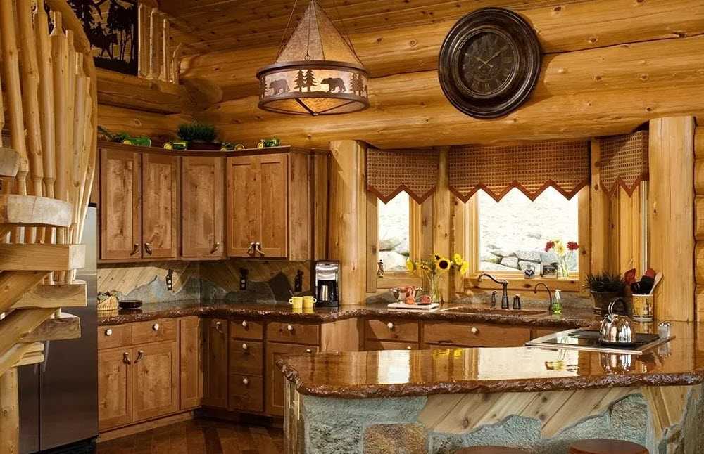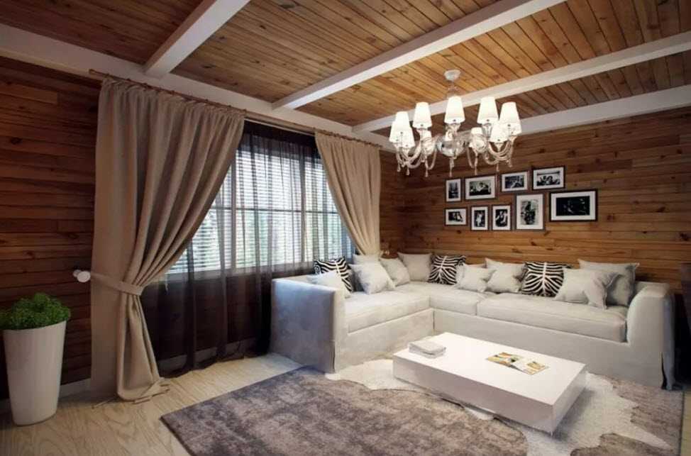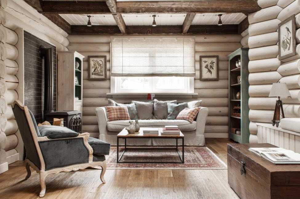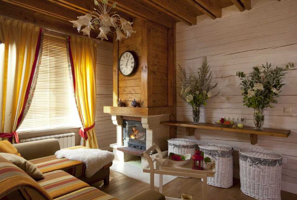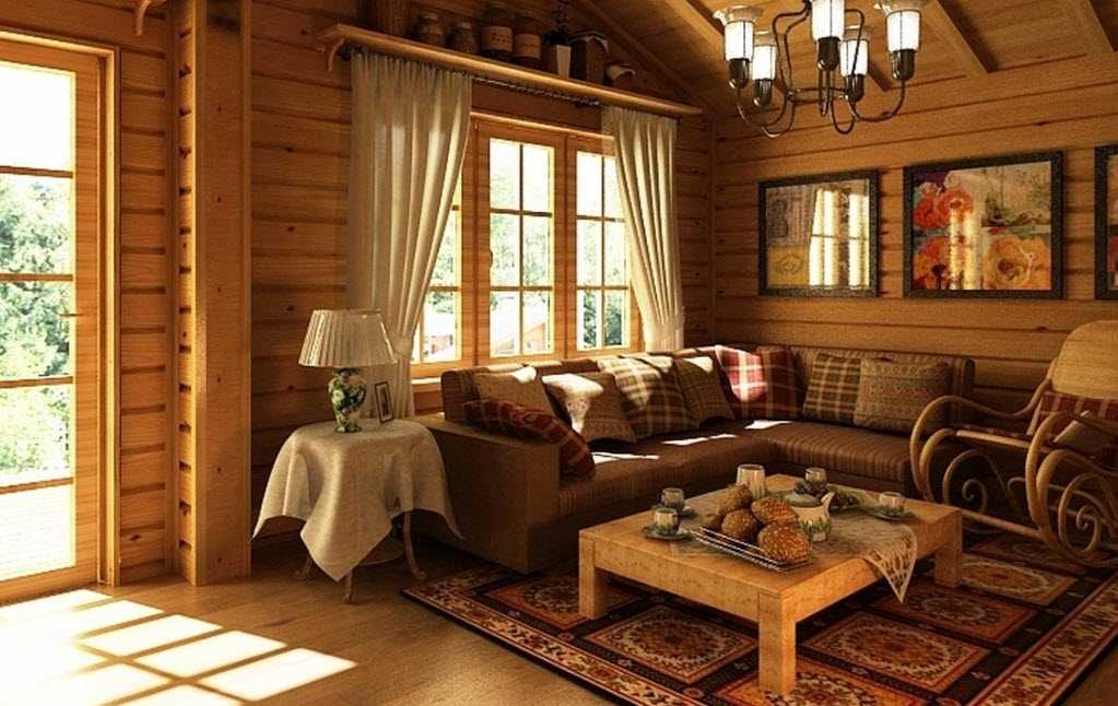 Для стиля кантри можно поставить кресло-качалку и деревянную мебель, а также повесить тканевые абажуры. В результате получается теплый и уютный интерьер дома из дерева.