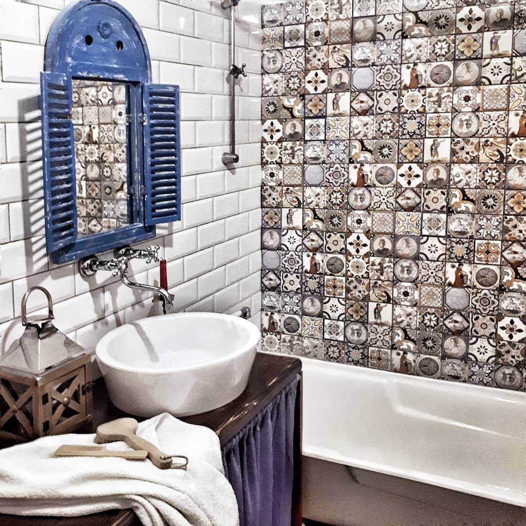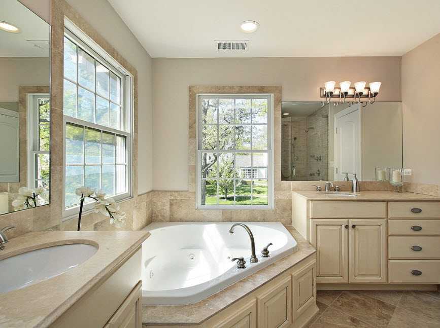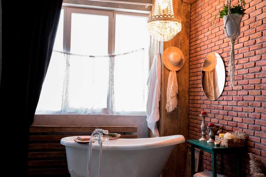 В деревенской ванной комнате нужно с осторожностью использовать дерево – из-за повышенной влажности необработанный материал может быстро потерять надлежащий вид. Обычно в отделке используют мраморные или каменные плиты