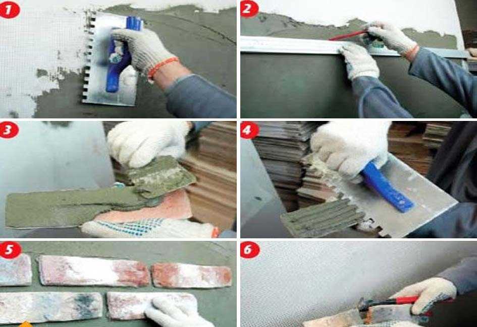 Предварительно необходимо нарисовать схему или нанести контур на стену для правильного размещения отделочного материала. Кладку начинают снизу вверх. Учитывая, что стена будет внизу защищена плинтусом, следует на эту высоту закрепить рейку, которая и будет основанием. После того, как будет положен первый ряд, нужно оставить его до полного высыхания клея — приблизительно на сутки. Проверив, что раствор схватился и камни надежно закреплены, можно приступать к следующим рядам. Для равномерных швов используют строительные планки, которые не позволят камню сползать