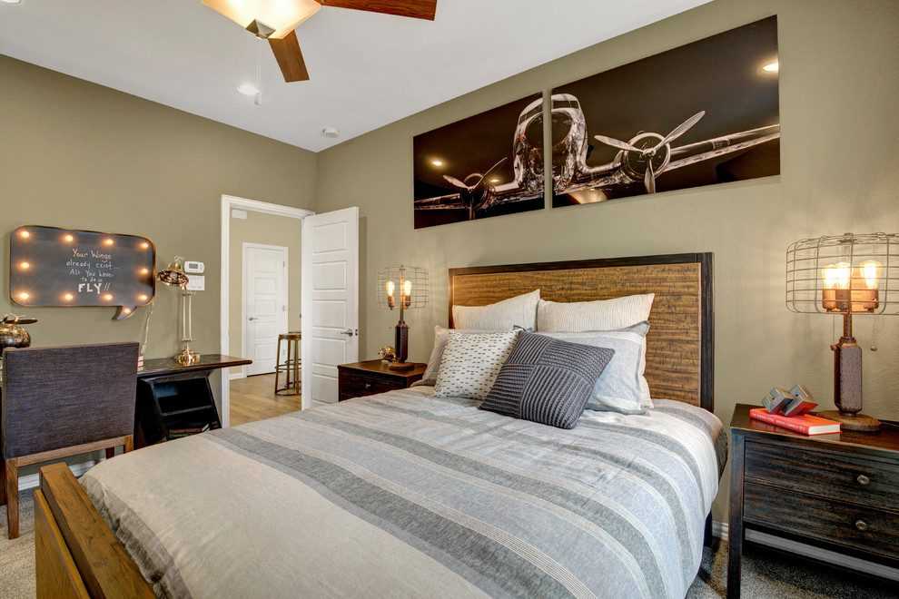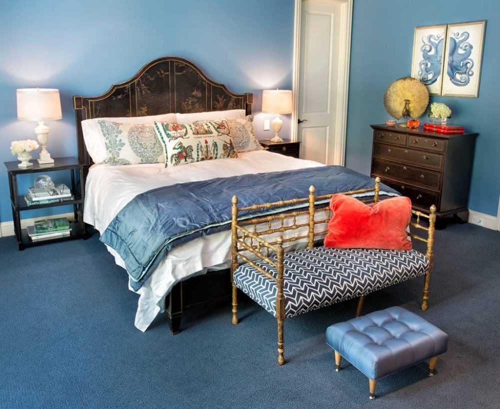 Спальню можно дополнить спокойными пейзажами или цветочными композициями: в приоритете здесь пастельные оттенки и мягкая техника исполнения.