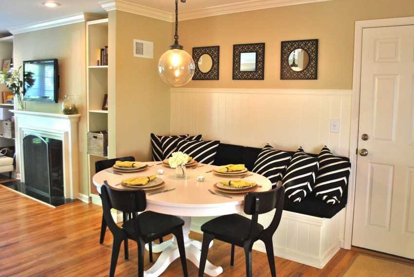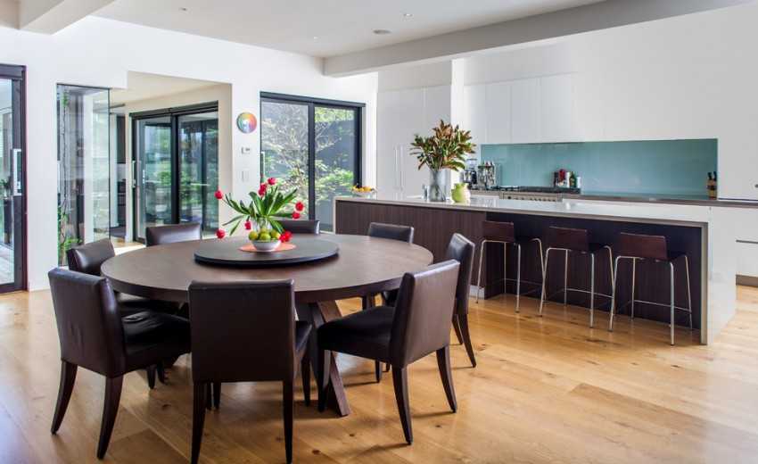Столовая зона может быть расположена в одном помещении с кухней, гостиной или находиться в совмещенной кухне-гостиной. От размеров выделяемого помещения зависит и то, что из обеденной мебели поместится, но стол со стульями присутствуют в любом случае. Они должны соответствовать выбранному стилю, быть подходящего размера и цвета.