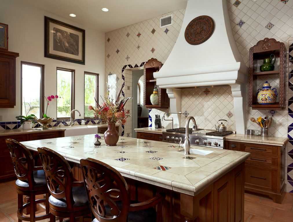 Наличие арок и красивого сводчатого потолка указывает на испанский вариант оформления кухни.
