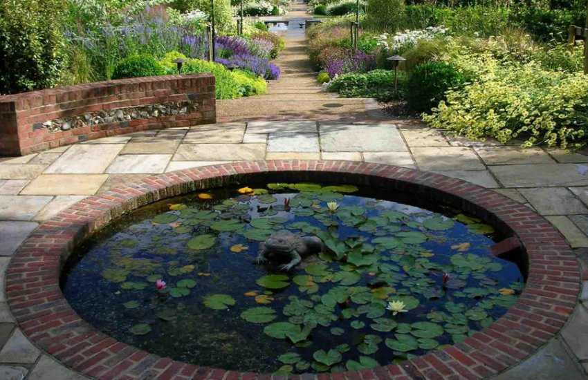 В этот проект можно вовлечь детей, им очень понравится. Ребята смогут при желании покрасить кирпичи, использовав сочетание различных красок, которые лучше всего дополнят общий дизайн. Для создания естественного пруда используйте старую ванну и битые или некондиционные кирпичи. Устанавливают её в яму на размеченной территории. При желании ванну внутри красят или покрывают специальной гидроизоляционной плёнкой. Потом приступают к декорированию пруда.
