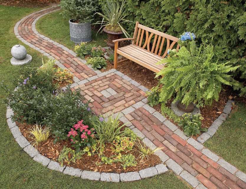 С внешней стороны дорожки можно посадить любимые почвопокровные растения вдоль краёв или посеять вечнозелёную траву, чтобы скрыть неровности. Ещё один вариант формирования тропинки заключается в укладывании битых кирпичей в шахматном порядке или «ёлочкой». Между стыками можно засыпать гравий. Кирпичная дорожка в виде спирали — отличный проект для небольших дворов. Также этот вариант можно использовать и на больших площадях. Спиральный вид завораживает, и он даёт гораздо больше места для посадки всех трав, которые нравятся. Для парадного входа в дом можно использовать любой рисунок. Добавление точно выровненной границы кирпичей добавит атмосферу формальности.