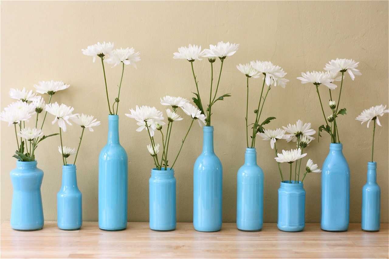 - Из стеклянных банок, бутылок можно сделать необычные вазы для цветов, для их декорирования используют ленты, бисер, также можно осыпать блестками и вскрыть лаком. Банки можно подвесить, поставить, разукрасить или просто наполнить цветами или ветками сухостоя — в любом случае это будет смотреться оригинально.