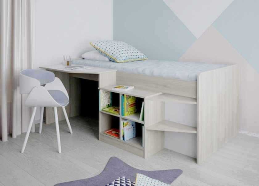 Параметры спального места – 90*190 см. Расцветка – белый/вяз. Изготовлена конструкция из березового массива и ЛДСП. Кровать многофункциональная, рассчитана на детвору и подростков. Максимально допустимая нагрузка – 90 кг. Матрас придется покупать дополнительно. Стеллаж открытого типа, состоит из четырех ниш. Письменный стол отличается удобством и небольшими размерами. Кровать можно дополнительно оснастить бортиком, чтобы защитить малыша от падения. В продажу поступает в разобранном состоянии. Общий вес набора – 85,2 кг.