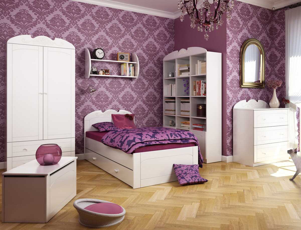 - Прованс. Дизайн мебели в этом стиле отличается эффектом нарочитой потертости. Шкаф, стулья, кровать комплекта в стиле прованс изготовлены в белом цвете. Обивка мягкой мебели часто декорируется цветочным принтом, комоды и тумбы отличаются большим количеством ящичков и полок. Светлый, немного кукольный дизайн станет любимым для девочек всех возрастов.