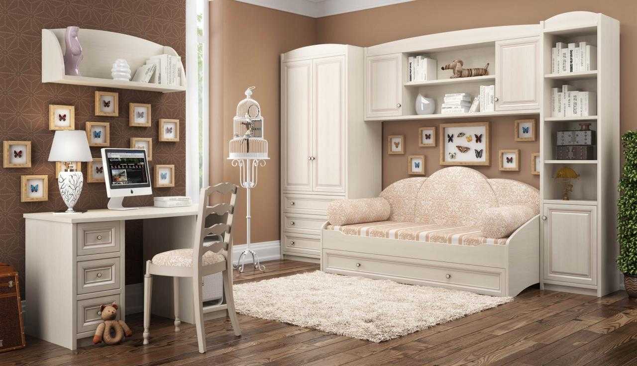 Набор рассчитан для девочек. Выпускается в бело-кремовом цвете. Множество декоративных элементов не может не радовать глаз. Они помогают превратить детскую комнату в сказочный дворец. Состав стандартный: письменный стол, кровать большого размера с привлекательной спинкой из велюра, украшенной пуговицами. Подлокотники закрыты мягким материалом. Ящики очень вместительные. Направляющие – широкие. Внутри поместится много нужных и полезных вещей. Все предметы устанавливаются на ножки из пластмассы. Стиль набора – прованс. Впишется в любой имеющийся интерьер. Ручки металлические с белыми вставками под золото. Фасад украшен бабочками и цветами. При изготовлении корпуса используется ДСП, декора – МДФ.
