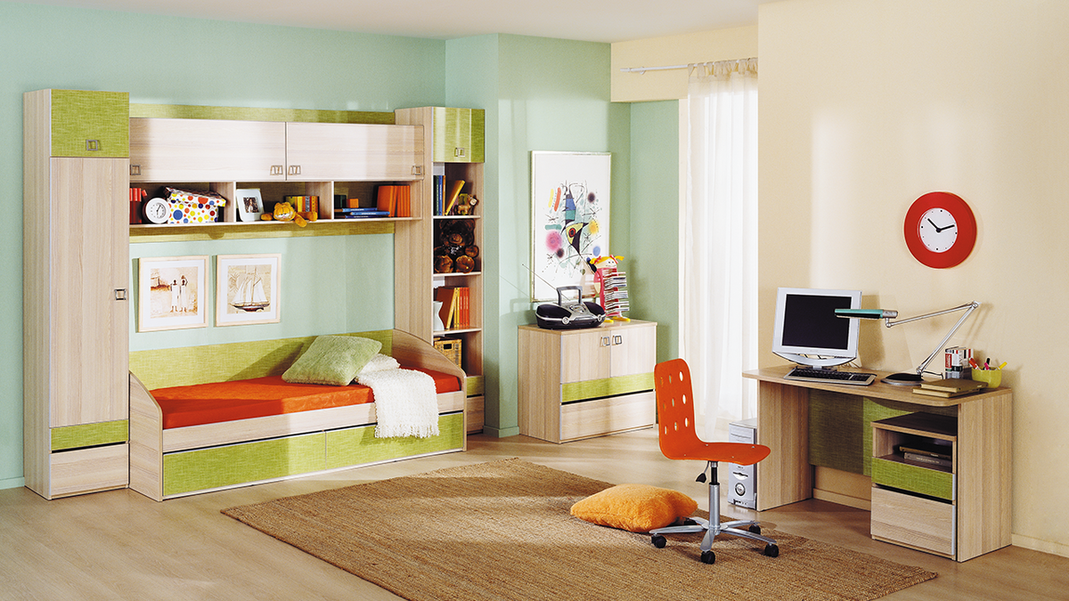 Шкаф. В комплекте может находиться как один, так и несколько шкафов с различной функцией. Обязательно иметь шкаф для одежды и книг. Стоит отказаться от стеклянных или зеркальных створок. Хрупкое стекло может от удара разлететься и травмировать малыша. Фурнитура должна быть качественной и надежной, не ломаться и не выпадать.
