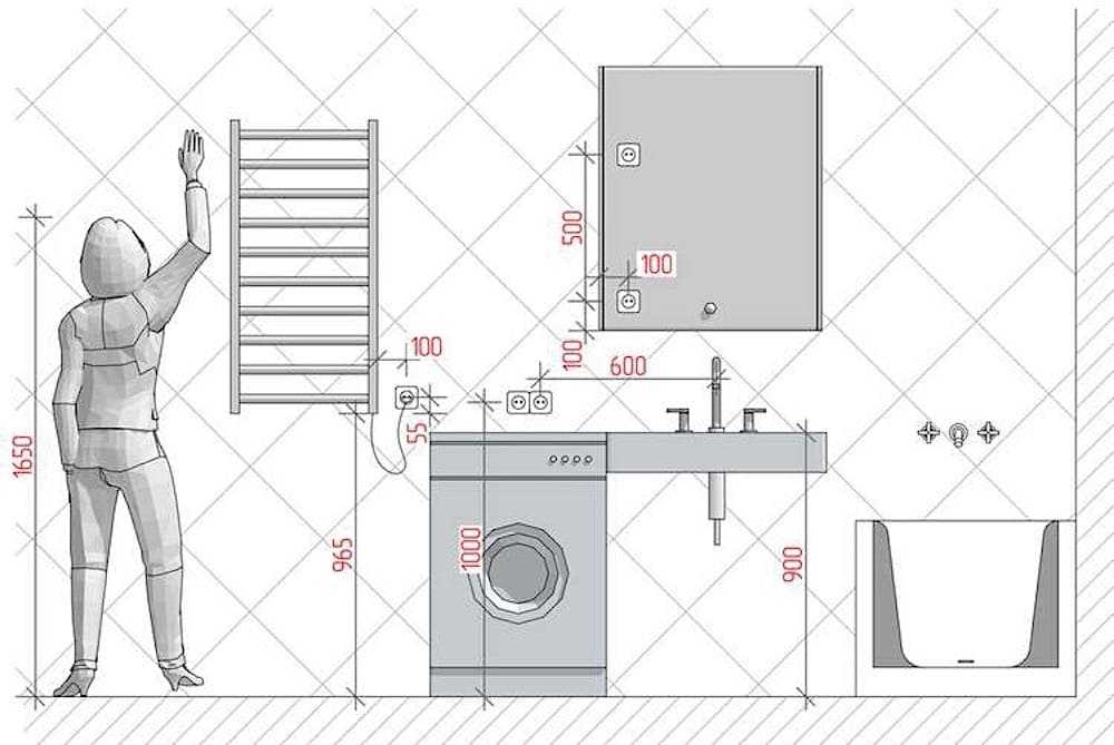 Что касается количества, то пары низкостоящих будет достаточно для стиральной машины и бойлера. Еще две понадобится для бритвы и фена. Их можно расположить на верхнем уровне. А если зеркалу требуется подсветка, то лучше оборудовать дополнительный скрытый выход.