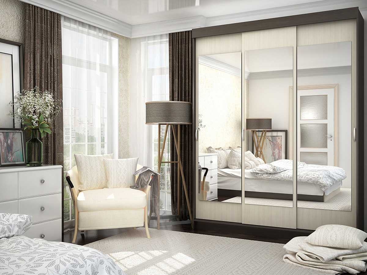 При подборе мебели стоит избегать больших объектов, занимающие драгоценные квадратные метры. Стоит сделать выбор в пользу шкафов-купе с раздвижными зеркальными дверьми.
