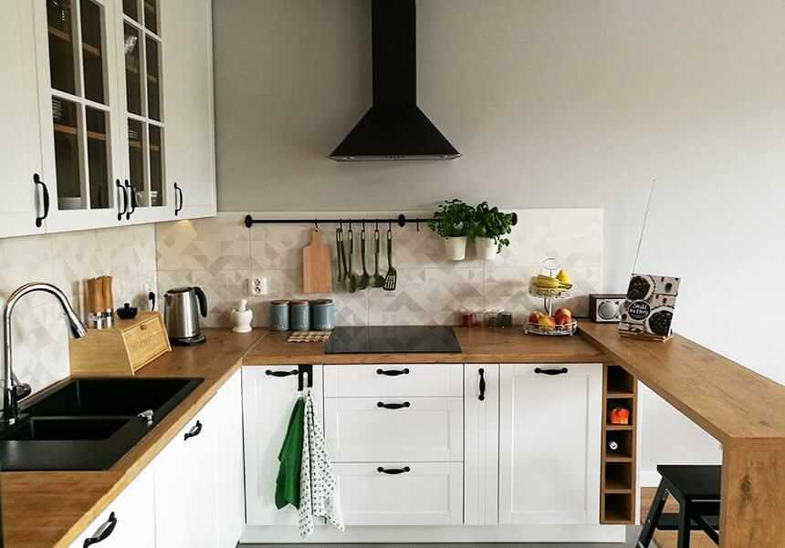 Какой бы грамотной ни была планировка кухни, визуальный шум в виде заставленной столешницы создает не только ощущение хаоса, но и делает помещение меньше. Поддерживать порядок помогут рейлинги, но их не должно быть слишком много – одного длинного и пары коротких будет достаточно. Также не стоит подвешивать на рейлинги множество предметов. Оставьте только что-то негромоздкое, что используете каждый день. Для мелкой техники, специй и других принадлежностей, которые часто оставляют на столешнице, заранее продумайте быстродоступное место в шкафах.