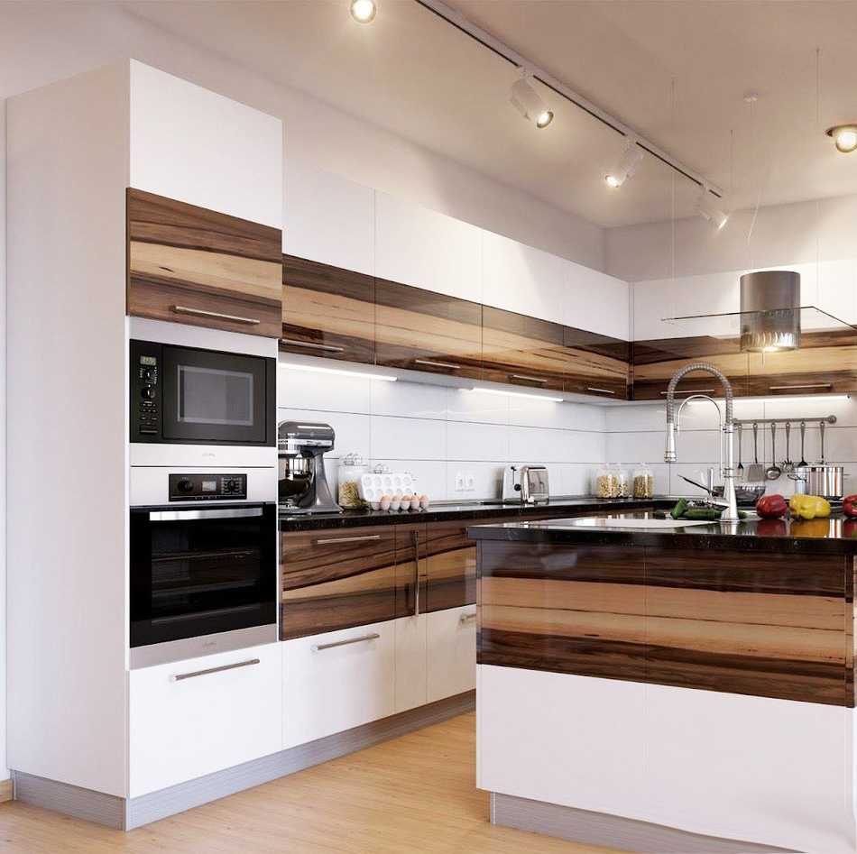 - Выставление рабочих поверхностей в один ряд на большой кухне. Если позволяет площадь, то вариант «остров» будет куда удобнее в использовании.