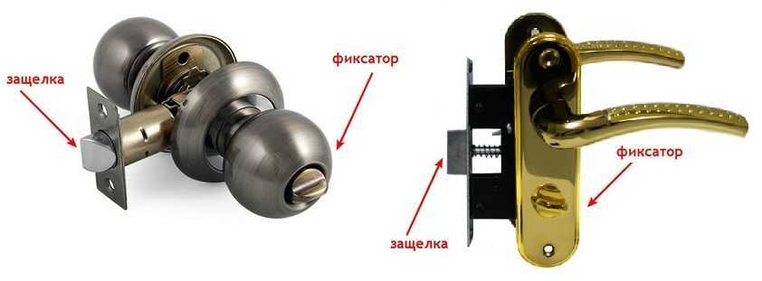 - нажатием — раньше очень часто использовались круглые кнобы с плоской шляпкой, нажав на которую, ручка фиксировалась и дверь не открывалась благодаря основному язычку замка;