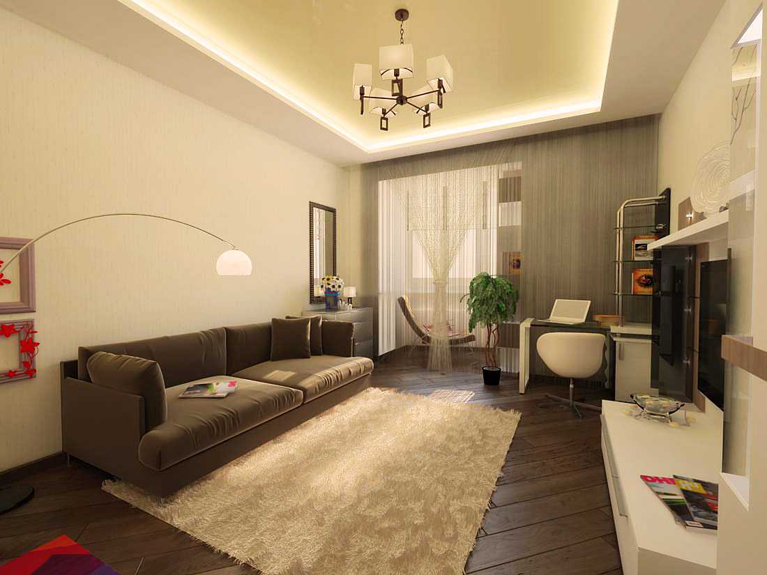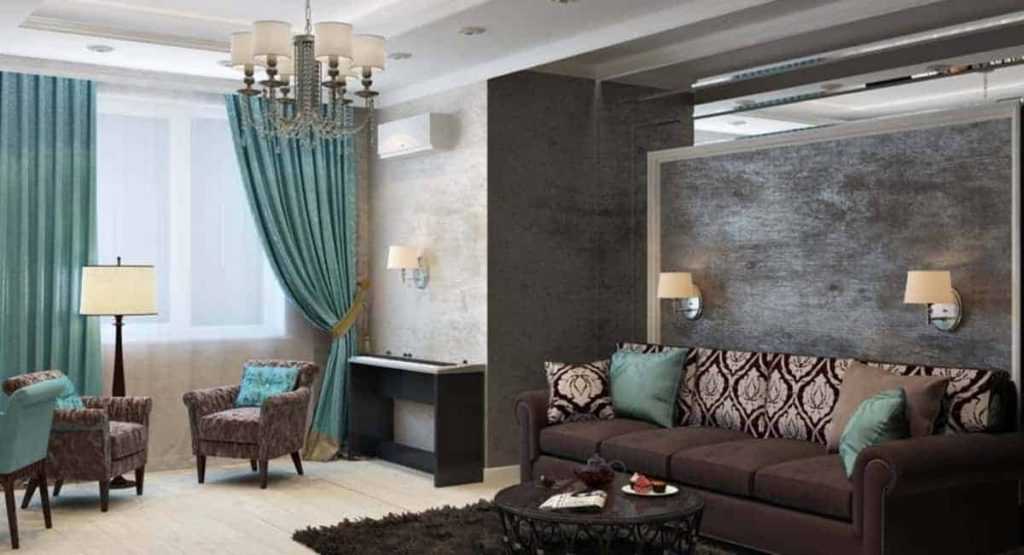В центре комнаты нужно повесить изящную люстру с хрустальными или стеклянными элементами. Лучше использовать многоуровневый потолок. Такой интерьер – это прекрасный вариант для квартир небольшой площади, но с высокими потолками и широкими окнами.