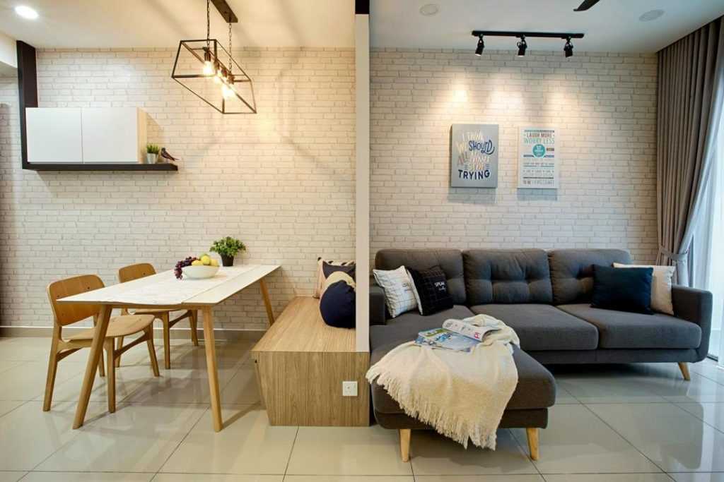 Дизайн однокомнатной квартиры для этой семьи выдежан в классическом современном стиле. Спокойная палитра в серых тонах не кажется скучной, потому что использованы яркие цветовые акценты, а дерево добавляет теплые оттенки. Решетчатые раздвижные двери смотрится стильно, и пропускает солнечный свет из окна.