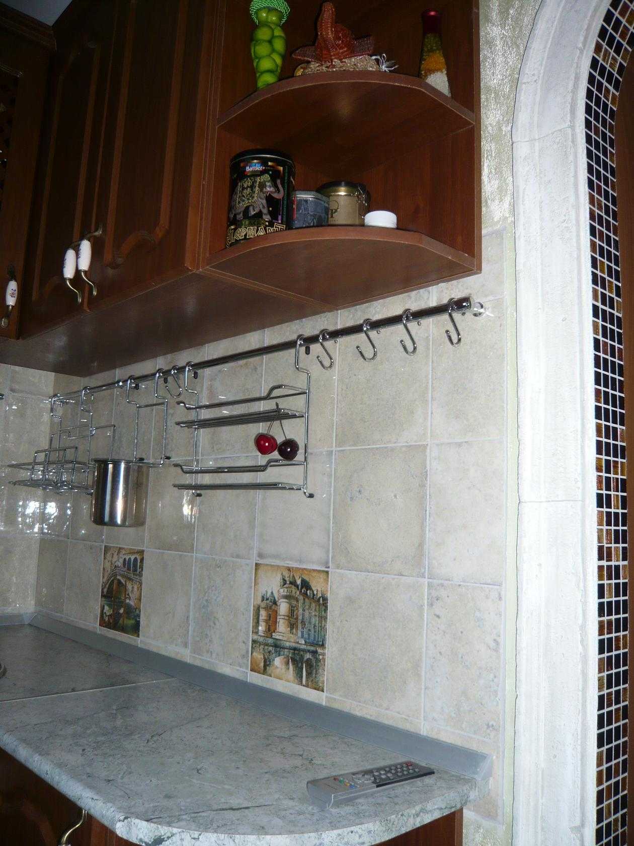 Для нахождения всегда «под рукой» мелкой кухонной утвари используется система удобных настенных приспособлений: