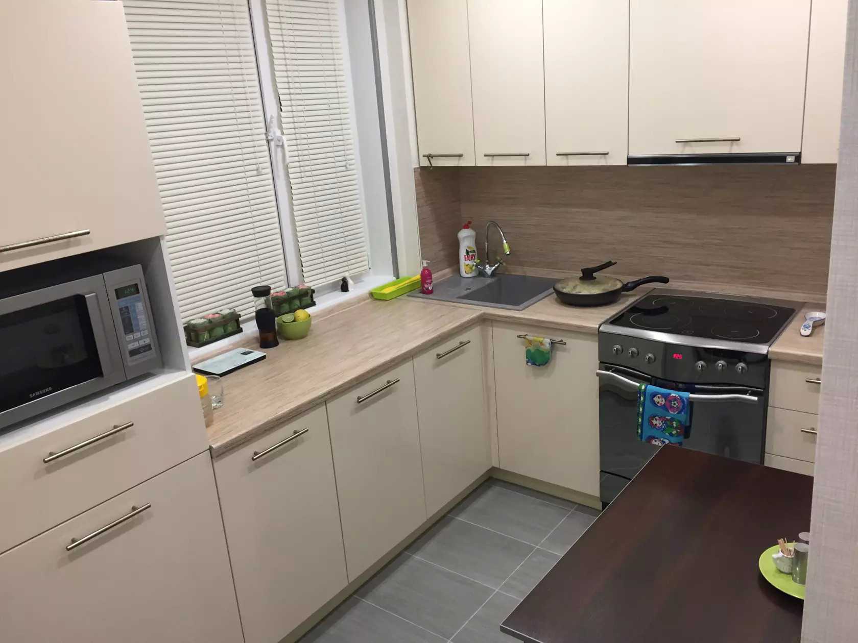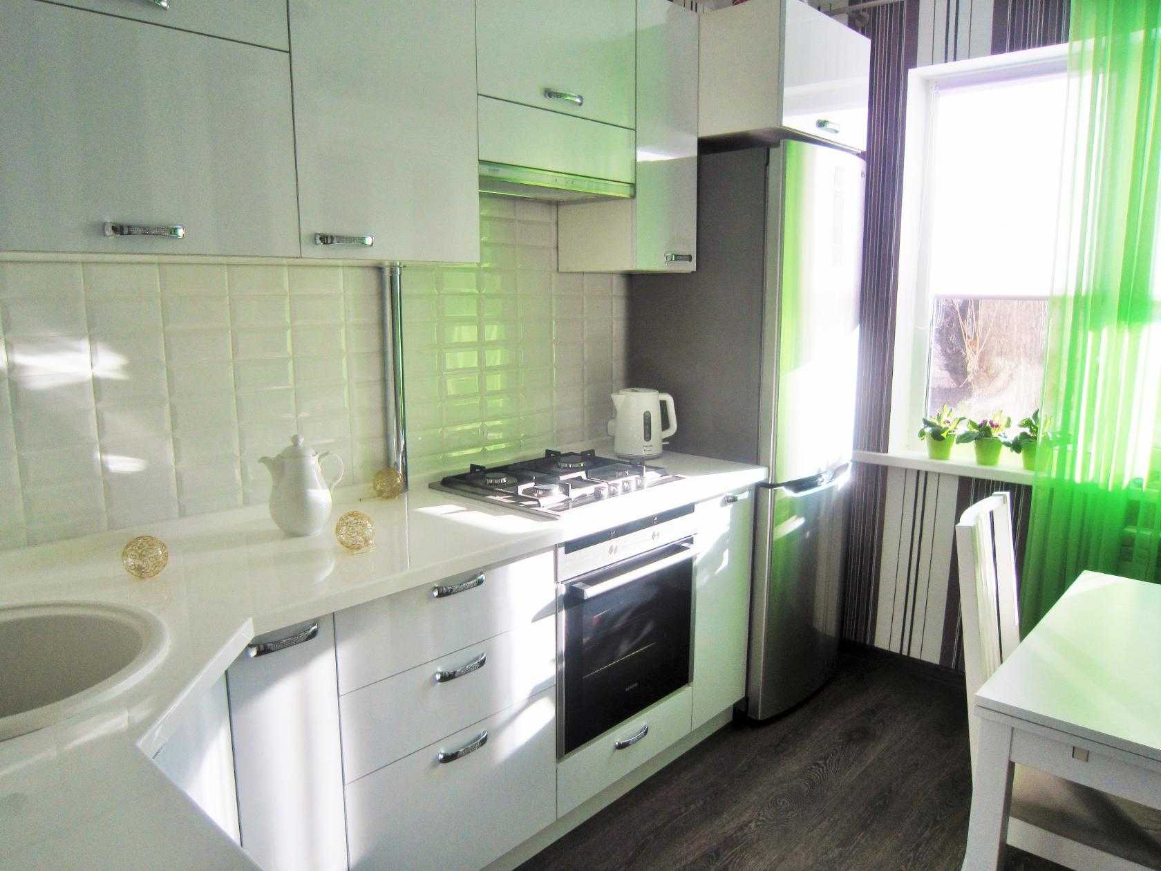 На малогабаритной кухне светлые тона должны преобладать во всем — это касается и мебели, и потолка, и стен, и даже пола.